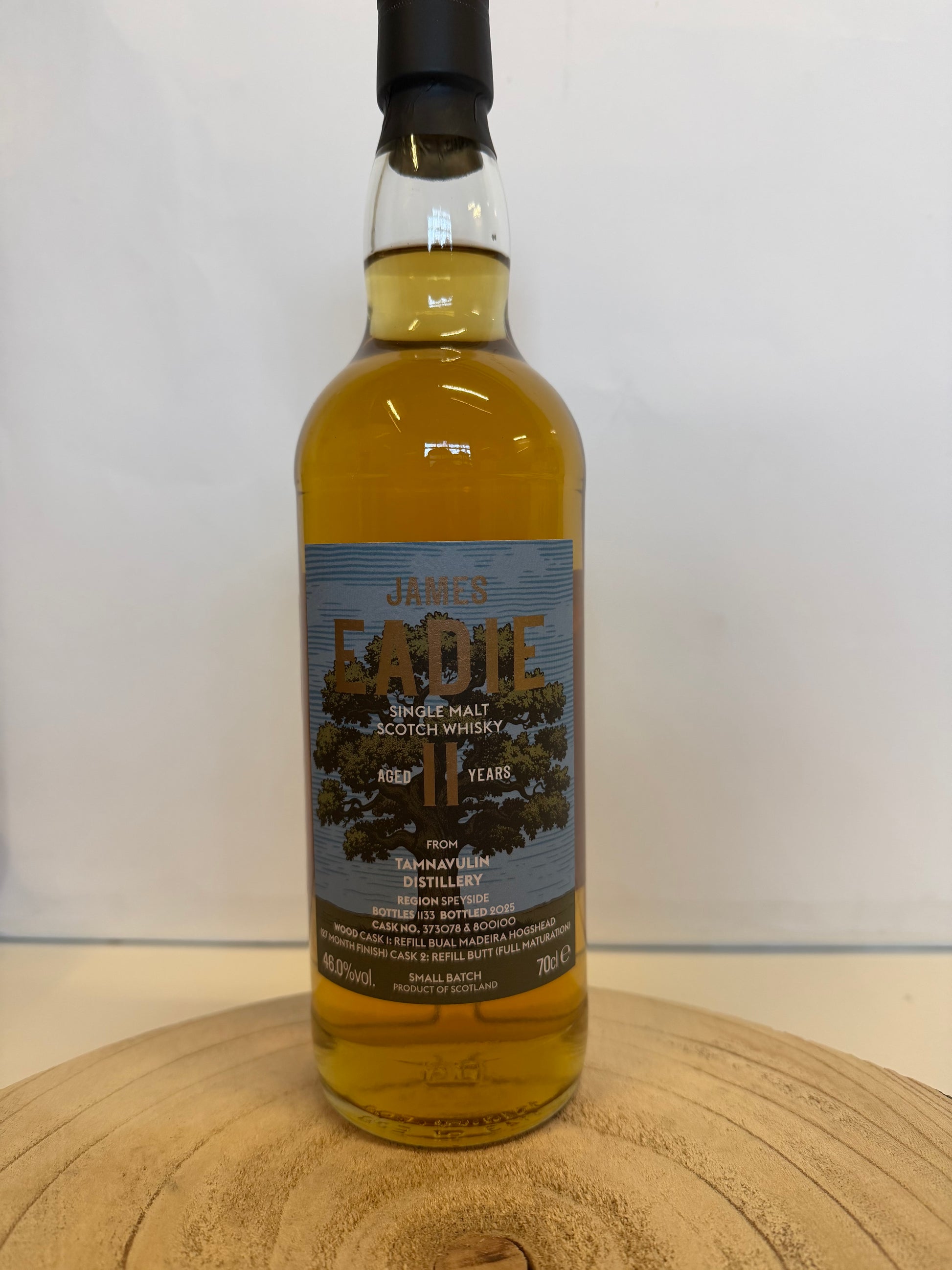 2014年に蒸留され2025年にボトリングされたこのウイスキーは、リフィルホグズヘッドで熟成された後、Refill Bual Madeiraカスク(#373078および#800100)で27ヶ月フィニッシュされ、自然色でノンチルフィルター仕様です。 James Eadieのインディペンデントボトリングで、TamnavulinのフルーティーなSpeysideらしいキャラクターにMadeiraのキャラメルと酸味が加わっています。